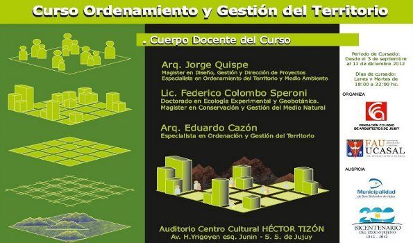 La Municipalidad de San Salvador de Jujuy lanzó un curso sobre Ordenamiento y Gestión del Territorio, organizado conjuntamente con la Fundación Colegio de Arquitectos de Jujuy y el aval académico de la Facultad de Arquitectura y Urbanismo de la Universidad Católica de Salta. Tendrá una duración de tres meses.