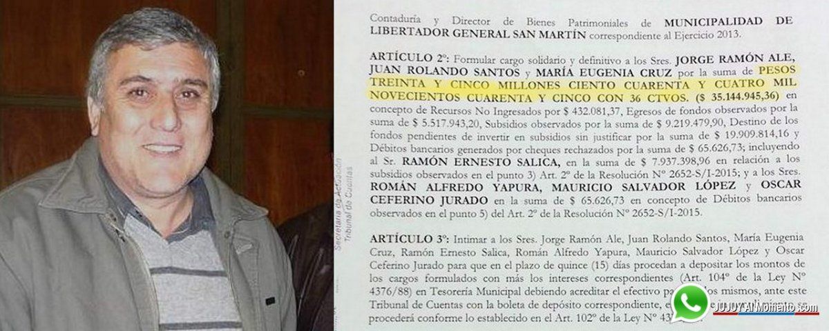 En las últimas horas salió a la luz un documento del Tribunal de Cuentas de la provincia, mediante el cual se intima al ex Jefe comunal de Libertador General San Martín (Capital del Departamento Ledesma) y un puñado de sus funcionarios, a devolver dicha suma, tras constatar que el municipio recibió el dinero - procedente tanto de la provincia como de la nación – y jamás realizó las obras correspondientes.