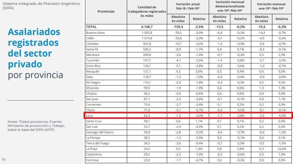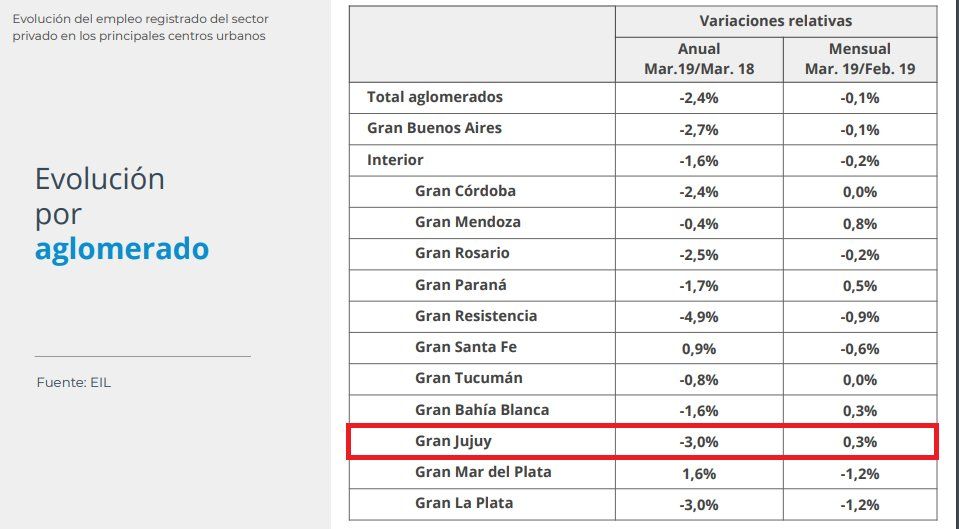 Utiliza dos fuentes de información: el Sistema Integrado de Previsión Argentino (SIPA) y la Encuesta de Indicadores Laborales (EIL). En ambos casos se registra una caída de puestos de trabajo para Jujuy.