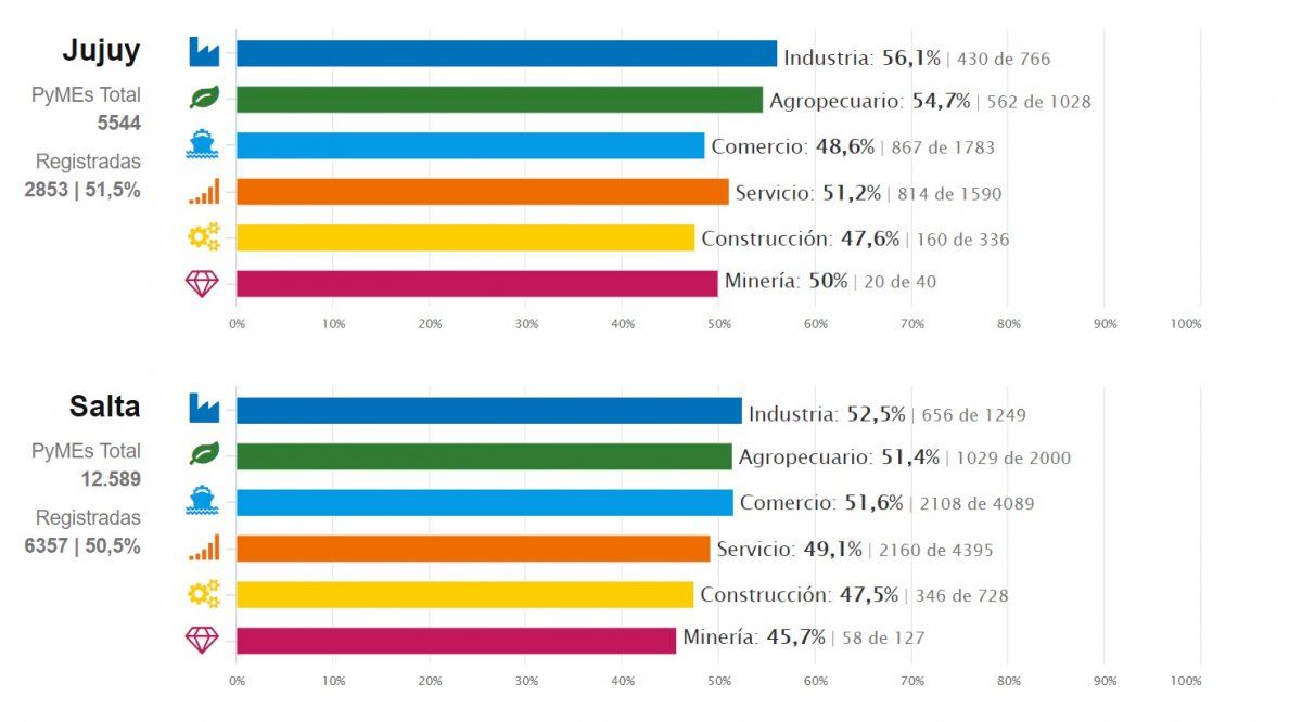 Según un relevamiento que actualizado por última vez el 23 de febrero de 2020 por el Ministerio de Producción de la Nación, en Jujuy existían previo a la llegada de la pandemia 5.544 PyMES en actividad, de las cuales 2.853 (el 51%) se encontraban registradas, es decir, inscriptas en la AFIP como empleadoras o no empleadoras que pagan IVA en el sistema tributario. Las restantes surgen de una estimación que hace el Estado a través de distintas áreas que miden la actividad de los emprendedores.