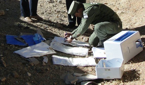 Con este panorama, mientras en un vehículo oficial comenzaba el rastrillaje por los caminos secundarios a la Ruta 9, el personal de Gendarmería detectó a unos kilómetros del desvío, una caja de color azul con vivos blancos deteriorada.