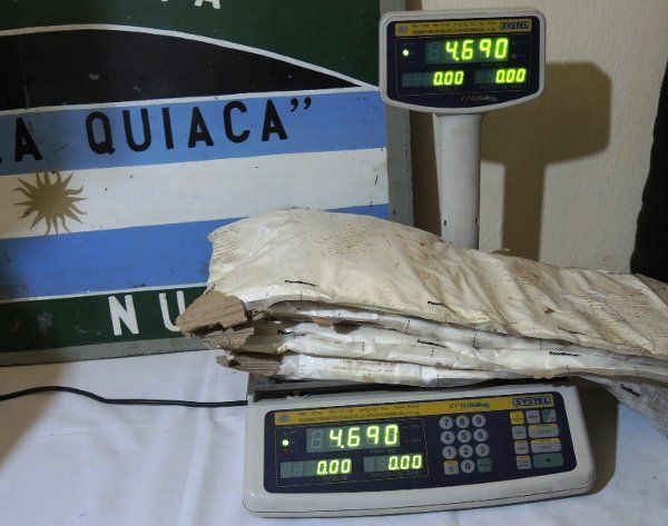 La prueba de campo (narco test) arrojó resultado positivo a la existencia de cocaína, totalizándose un pesaje de casi cinco kilos de cocaína.