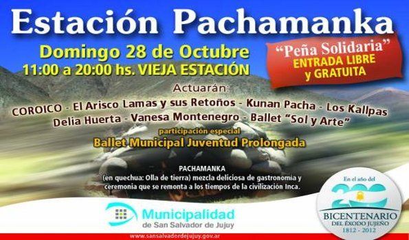 “Estación Pachamanka” es una realización de la Municipalidad de San Salvador de Jujuy, a través de las distintas dependencias de la Secretaría de Desarrollo Humano. Consiste en un festival solidario, donde se hará la ceremonia de la Pachamanka, que es una ancestral forma de cocinar en un horno ecológico hecho en la tierra, que todavía se utiliza en la zona andina.