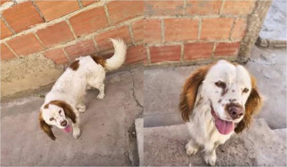 El peludito es de porte mediano y pelaje color blanco y manchas marrones.