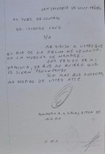 Mediante una nota de puño y letra de la propia Sala, ella comunicó al Juez de Control Isidoro Cruz que desistía de seguir realizando la huelga de hambre por pedido de su familia, ya que no quería seguir preocupándolos.