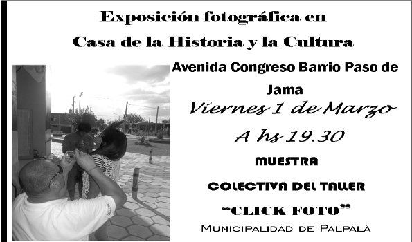 El viernes 1 de marzo, en la Casa de la Cultura de Palpalá a las 19.30 se realizará la exposición de los trabajos fotográficos realizados en el taller de dictado por la profesora Ana Tolaba.