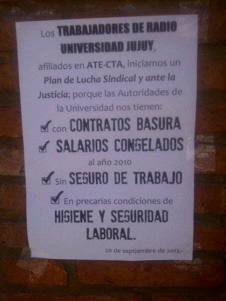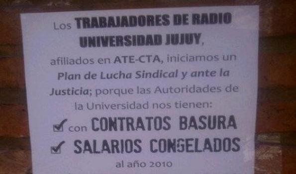 Después de más de 5 meses de negociación en los que se consideraban aspectos salariales y condiciones laborales, los trabajadores de Radio Universidad recibieron por parte del Rector de la Universidad Nacional de Jujuy como respuesta, primero el desconocimiento como trabajadores, y segundo la afirmación que “es absolutamente falso que exista situación de precariedad laboral respecto de las personas que trabajan en Radio Universidad”, mediante una nota escrita con fecha del 5 de septiembre pasado.