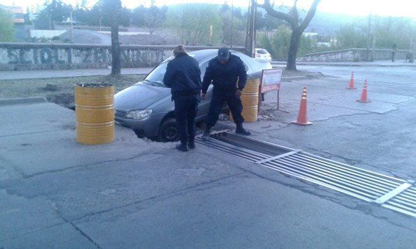 El asfalto cedió y uno de los vehículos que por allí circulaba termino atrapado en un enorme bache poniendo en evidencia el mal estado en el que se encuentran muchas de las calles del ejido urbano.
