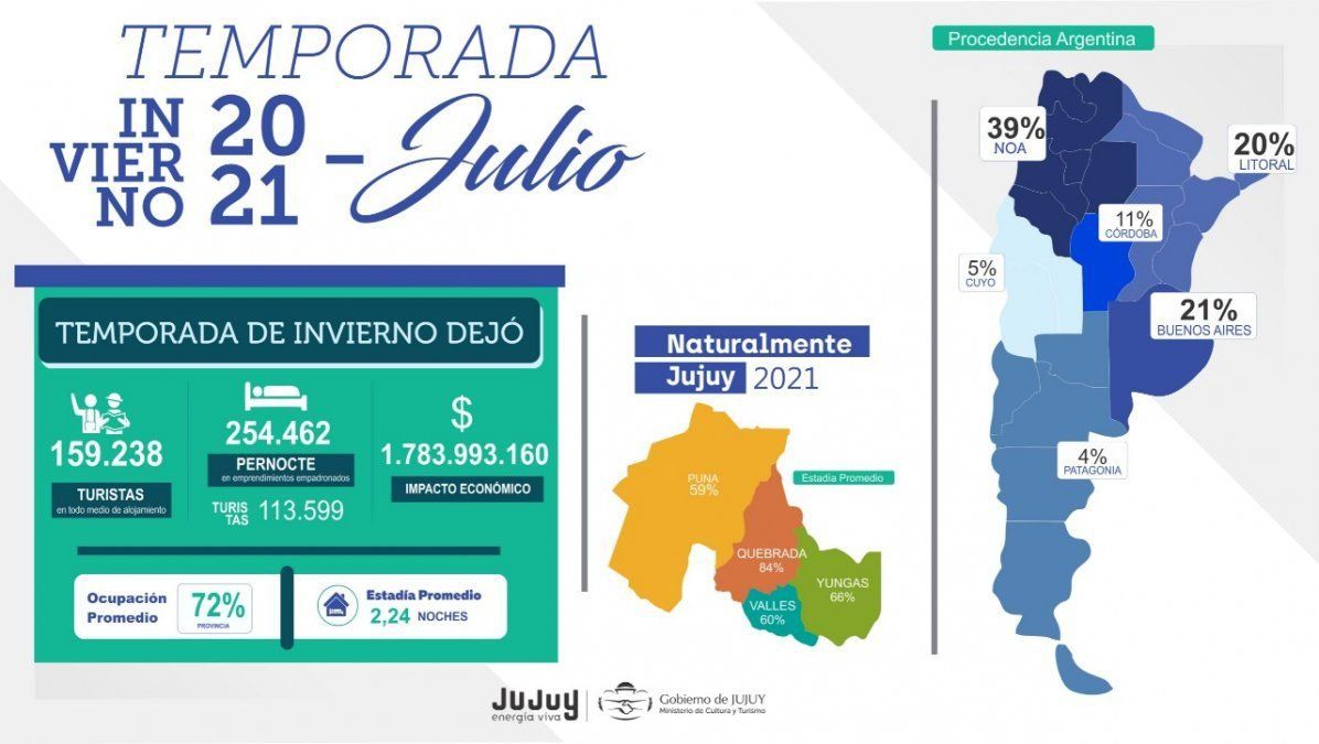 En detalle emitido por el Observatorio turístico indica que la ocupación provincial fue del 72% con picos del 93% en Purmamarca, 87% en Tilcara, 82% en Maimará, 77% en San Francisco y 47% en San Salvador de Jujuy.