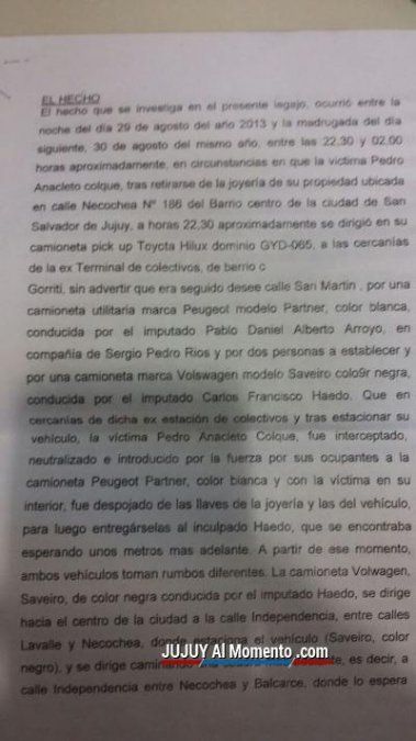 Según la requisitoria fiscal, el conocido comerciante salió el día 29 de agosto aproximadamente a las 22.30 de la joyería de su propiedad, ubicada en Necochea 186, para dirigirse en su camioneta hacia la zona de la vieja terminal de ómnibus, donde supuestamente habría sido interceptado por Pablo Daniel Arroyo y Sergio Pedro Ríos, quienes se encontraban a bordo de una camioneta Peugeot Partner de color blanca. En ese lugar secuestraron a Colque y le quitaron sus pertenencias, las llaves del negocio y las de su rodado.