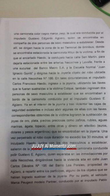 Agüero habría acompañado a Haedo y junto a otras personas habrían ingresado al local para proceder a violentar algunas cajas de seguridad existentes en el lugar, abrir otras con las llaves que le habían quitado a la víctima y apoderarse de dinero en efectivo, tanto pesos como monedas extranjeras entre ellas dólares y euros, como así también joyas de oro y plata, piedras preciosas todo ello de mucho valor.