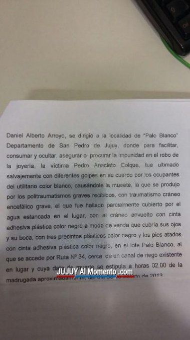 En tanto Arroyo en su camioneta y con Colque en su interior, se habría dirigido a Lote Palo Blanco, lugar este donde consumaría el brutal asesinato del joyero. Brutalmente maniatado, ya que sus manos y pies estaban atados con precintos, con su boca y ojos tapados con cinta adhesiva negra, recibió una feroz golpiza especialmente en su cabeza, lo que le provocó un politraumatismo encefálico grave y su deceso.