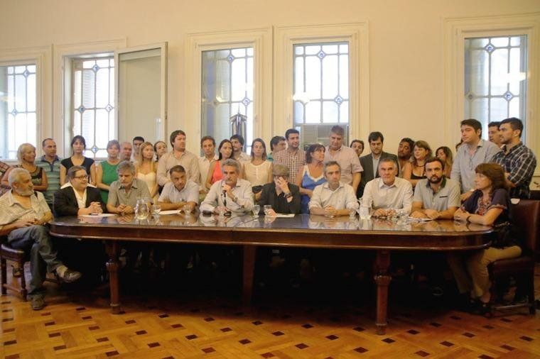 Legisladores nacionales y del Parlasur del FpV, dirigentes del Movimiento Evita, de Nuevo Encuentro, del MST y del Partido Socialista de los Trabajadores, entre otros, realizaron una conferencia de prensa en las oficinas de la sede del Frente de la Victoria de la Cámara de Diputados, ubicada en el tercer piso del Palacio Legislativo.