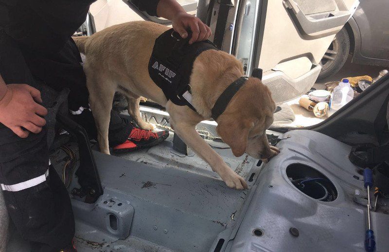 El delito fue detectado por evaluación de perfiles de riesgos, con intervención de dos canes entrenados para la detección de narcóticos y divisas, que marcaron indicios en el asiento trasero del automóvil.