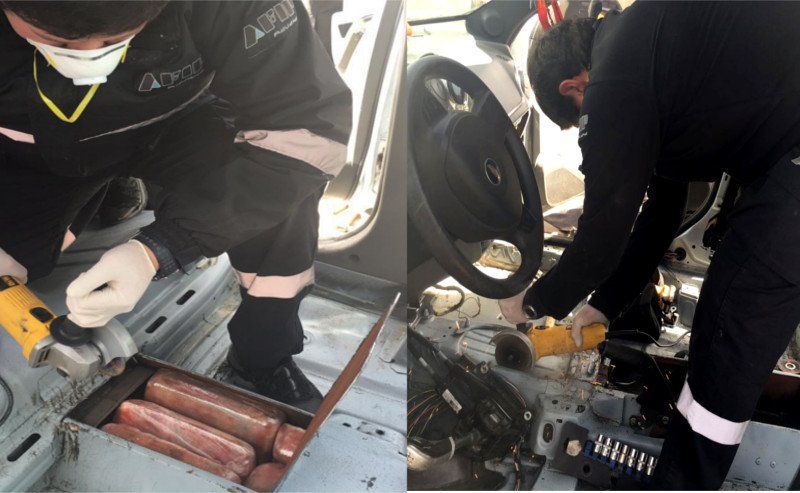 En el último procedimiento, los agentes aduaneros secuestraron 29,775 kg de cocaína, luego de detectar la presencia sospechosa del estupefaciente estaba oculto en una estructura metálica armada y soldada en el eje central del piso interior de un vehículo Chevrolet Agile de patente argentina.