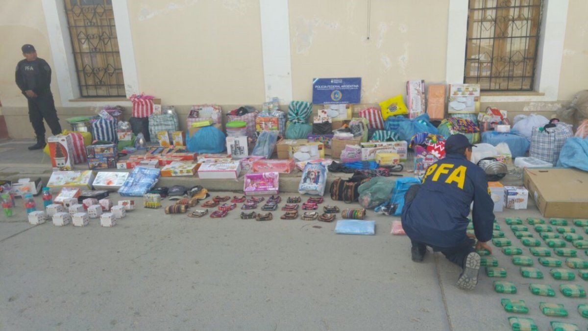 Encontraron en total 104 paquetes de hoja de coca en estado natural, 300 unidades de bazar doméstico, una bicicleta todo terreno, 35 artículos regionales, 150 juguetes y 200 kilos de ropa usada, las cuales habían sido ingresadas al país de forma ilegal, procediéndose a su secuestro.