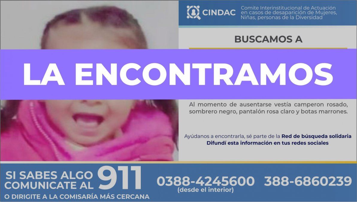 Tras horas de desesperación, lograron dar con el paradero de la menor. Así lo confirmó el CINDAC (Comité Interinstitucional de Actuación en casos de desaparición de Mujeres, Niñas y personas de la Diversidad).