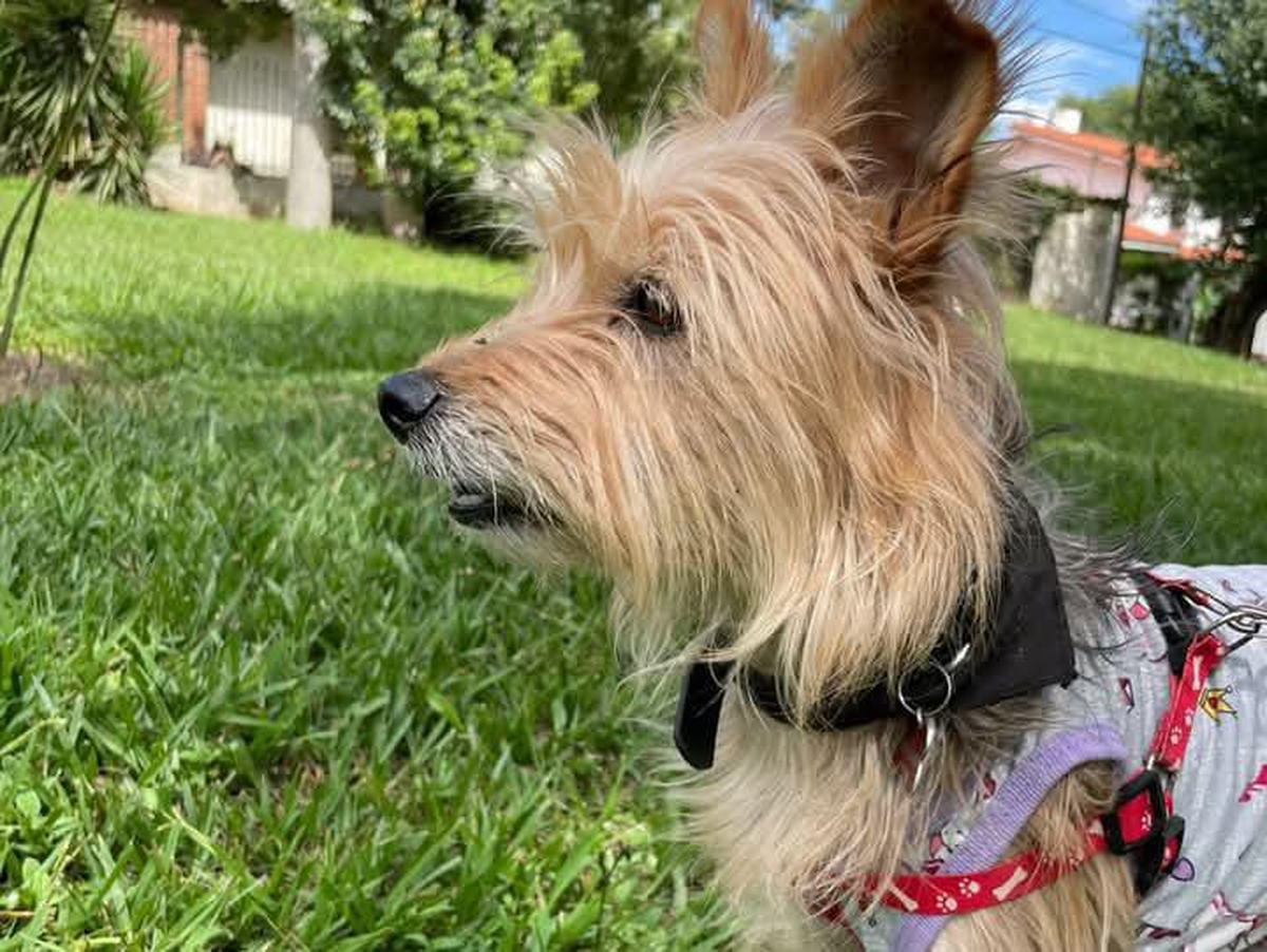 Es de porte mediano y pelaje color marrón claro. Además lleva una chapita identificatoria. Sus dueños están consternados debido a que hasta el momento no logran encontrarla.