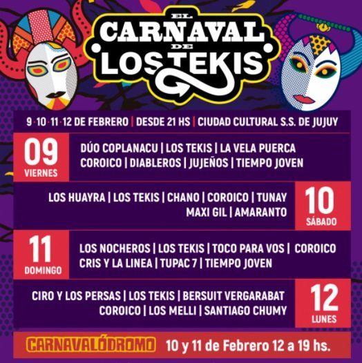 Sábado 10 Ritual de desentierro de Carnaval, Los Tekis, Coroico, Jujeños, Jasy Memby, Amaranto, Dj Ariel Bellone.