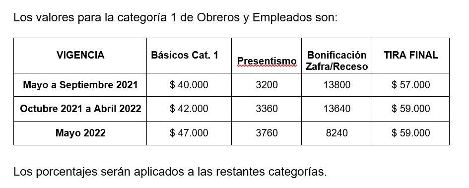 El salario básico del trabajador azucarero de Categoría 1 llegará en abril de 2022 a $ 47.000. La tira final será de $ 59.000.