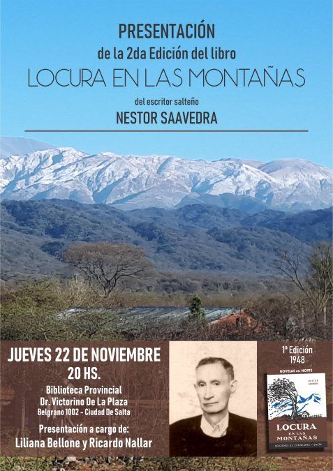 La escritora salteña, Liliana Bellone, nos hace llegar un comentario sobre la reedición de Locura en las montañas de Néstor Saavedra, Salta, Editorial Hanne, 2018, auspiciada por el Fondo Editorial de la Secretaría de Cultura de la Provincia de Salta. Fue publicada en 1948 por Ediciones El Estudiante, en la Colección “Rama al Norte” que dirigía el poeta Manuel J. Castilla.