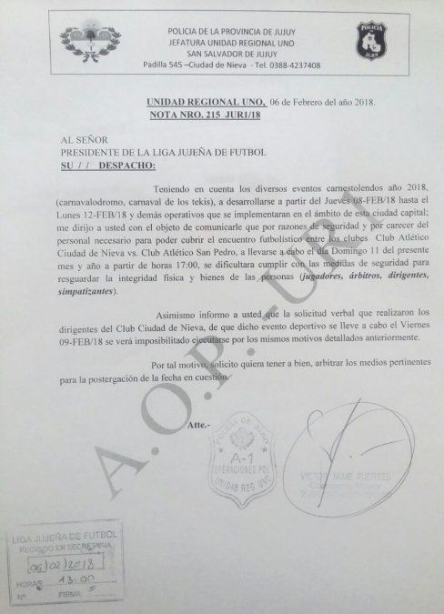 Policía de la provincia informó a la Liga Jujeña de Fútbol que a raíz de los eventos carnestolendos, el personal no alcanzará a cubrir el evento futbolístico por lo cual solicitaron la reprogramación del mismo. Nieva y Atlético San Pedro tenían previsto el encuentro para el domingo a la tarde.