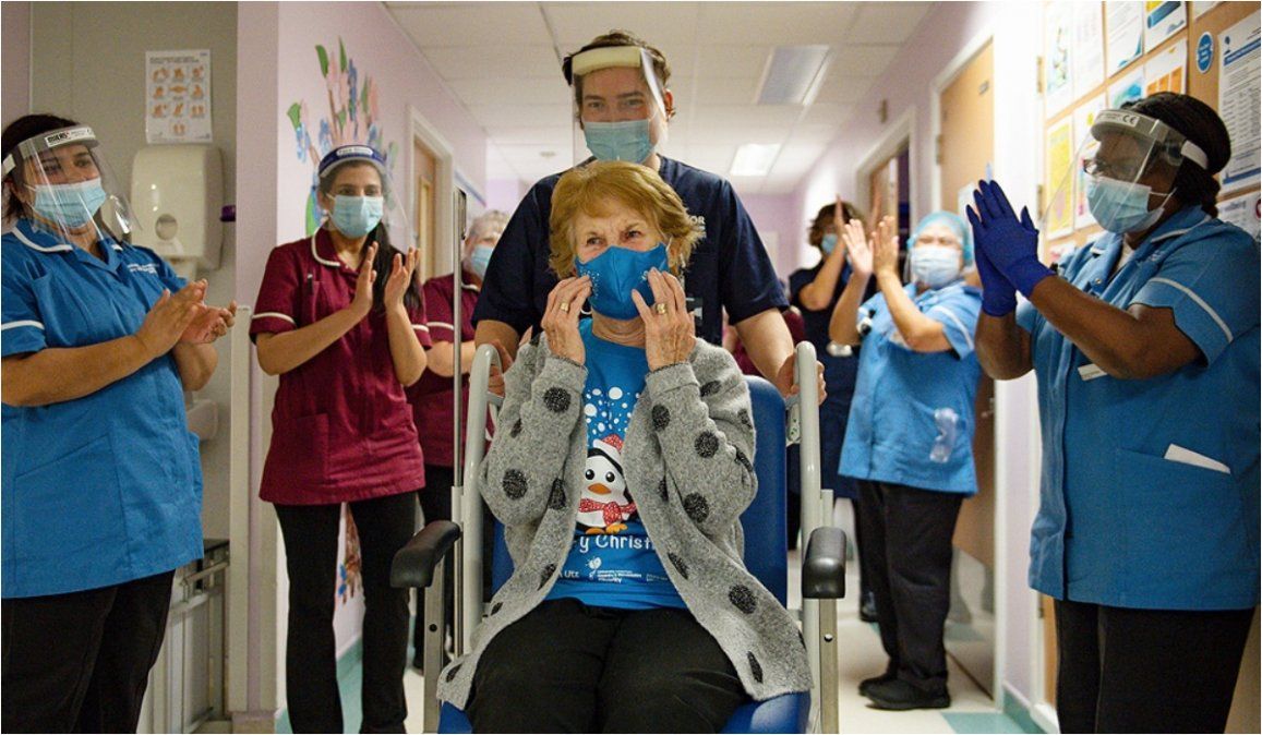 Esta mujer de 90 años, 91 dentro de una semana, ha sido la primera persona del mundo en recibir una dosis del combinado de Pfizer-BioNTech, una semana después de su aprobación por el Reino Unido.
