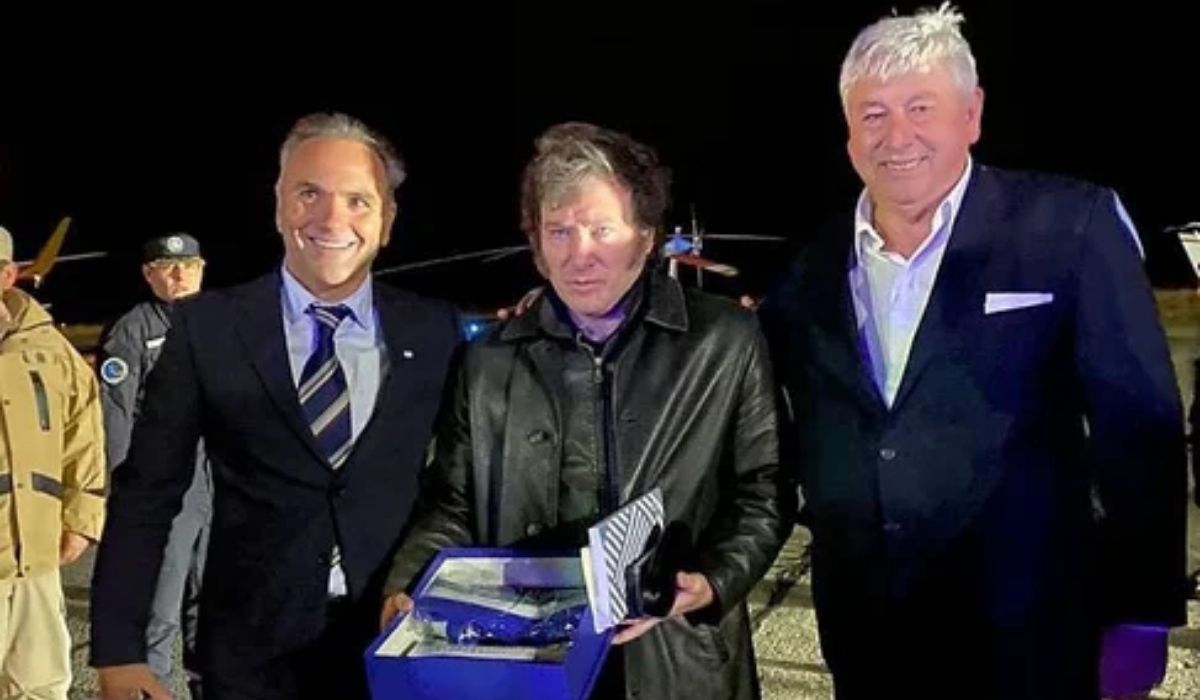A su arribo, junto a Karina Milei y Manuel Adorni, fue recibido por el intendente Walter Cortés y el ministro de gobierno Federico Lutz y se trasladó en helicóptero hasta el hotel Llao Llao.