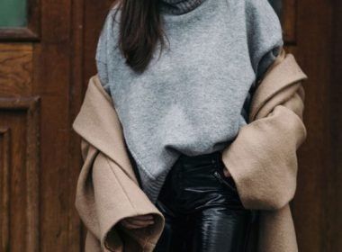 Look #2: Pantalones de cuero + Sweater de cuello alto + Abrigo camel.