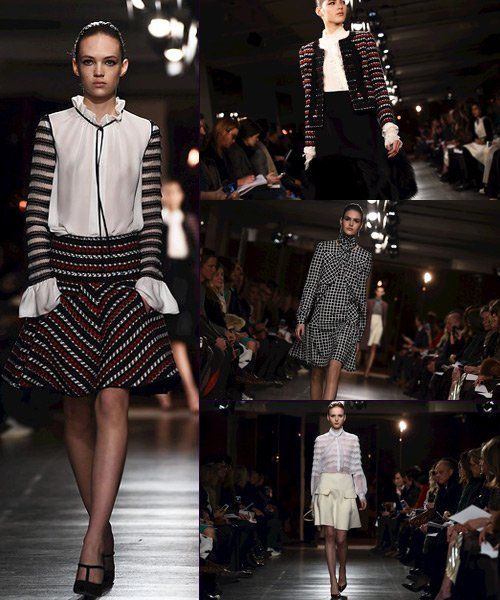Las prendas de día tienen una línea definida, se acercan al cuerpo pero sin marcar. Vemos blusas muy trabajadas, con cuellos ligeramente ondulados, transparencias fáciles de llevar, chaquetas en tweed de tres colores (rojo, negro y blanco) y faldas por encima de la rodilla, siempre con un ligero y grácil volumen evasé que invita al balanceo. Los abrigos, sin cuello, y de patrón sencillo encierran la esencia del glamour joven que arrasa en las pasarelas.