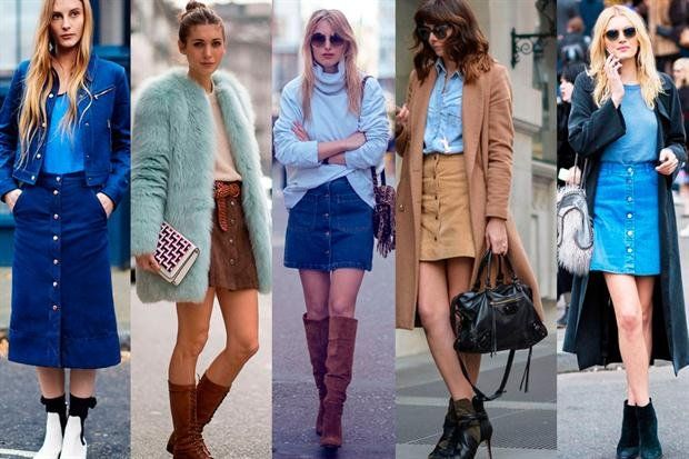 Lo ideal para este look, es que para el calzado escojas zapatillas o zapatos con plataforma. Opta por una falda de mezclilla del largo que tu quieras (aunque preferentemente lo mejor es sobre la rodilla). Para la parte superior, puedes elegir una blusa de mezclilla y colocarla dentro de la falda, o bien, un crop o una polera con el diseño que tu quieras.
