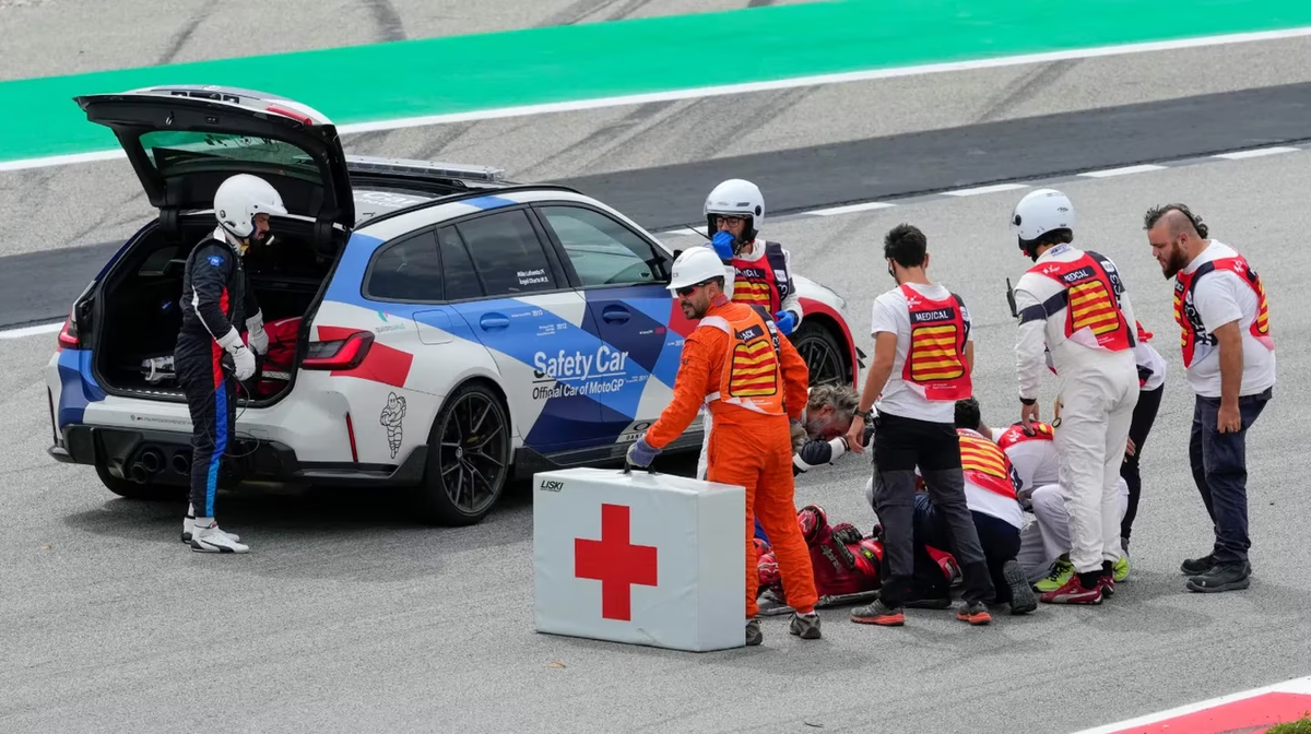 El líder del mundial de MotoGP, el italiano Francesco “Pecco” Bagnaia (Ducati Desmosedici GP23), sufrió un violento accidente en el GP de Montmeló y tuvo que ser atendido de urgencia en medio de la pista.