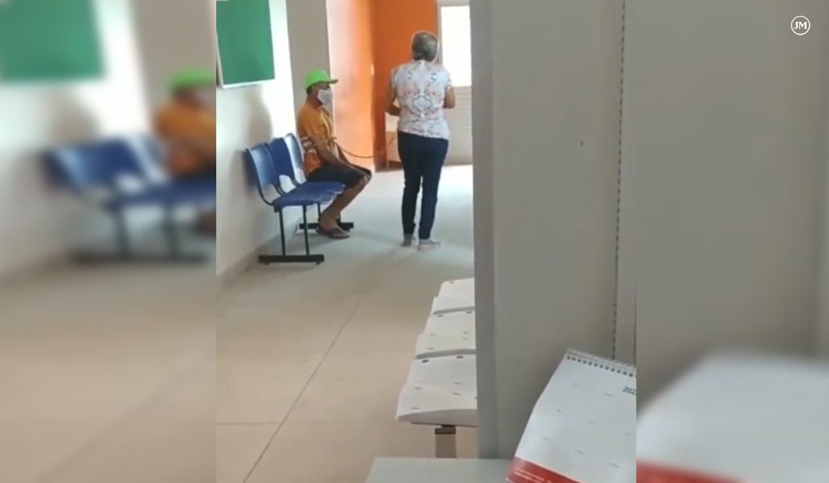 Una mujer sujeta con una soga a un hombre, que espera sentado en un centro de vacunación. Esa es la imagen que se ve con claridad en un video difundido en redes sociales que, según trascendió, corresponde a una mujer de Rio Largo, en el noreste de Brasil, quien llevó a su pareja a que reciba la vacuna contra el Covid-19.