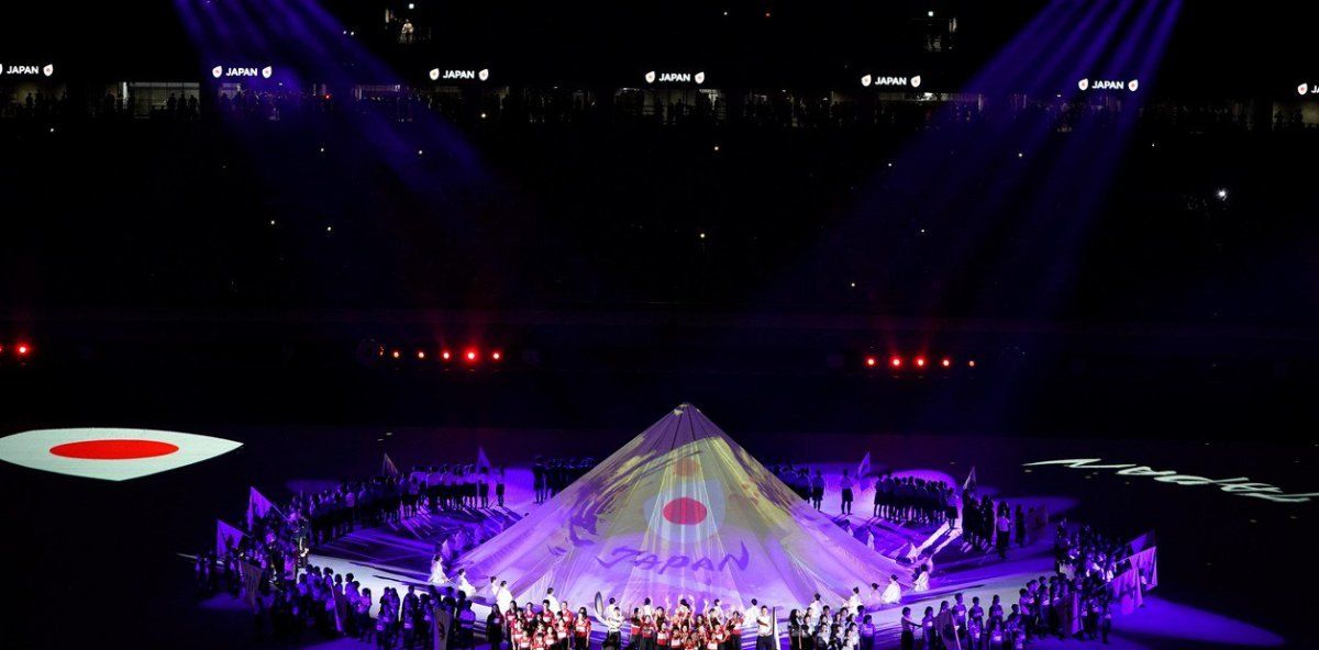 Tradición y modernidad, Japón se mostró al son de tambores, mientras los bailarines recorrían un mapa virtual de cada una de las doce ciudades organizadoras por etapas. El nacimiento y la evolución del rugby apareció después en imágenes sobre un Monte Fuji nevado, rodeado por niños, embajadores de los veinte países participantes.