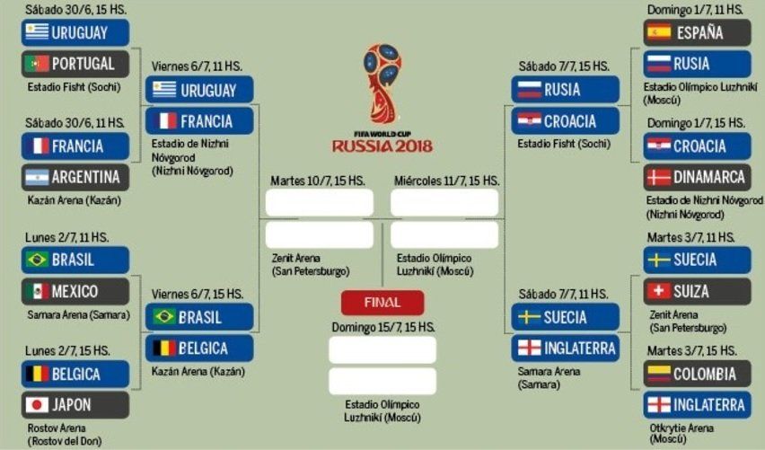 Los cuartos de final, iniciarán el próximo viernes 6 de julio a las 11 horas en el estadio de Nizhni Nóvgorod, donde se enfrenten Uruguay y Francia.
