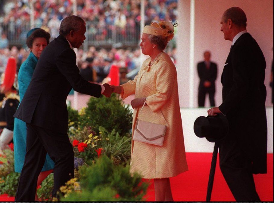 10 El presidente de Suráfrica, Nelson Mandela (i), estrecha la mano de la reina Isabel II de Inglaterra durante una parada de la Guardia a caballo en Londres, en su primera visita oficial a Reino Unido, el 10 de julio de 1996. A la derecha, el príncipe Phillip y la princesa Anne junto a Mandela.ASSOCIATED PRESS
