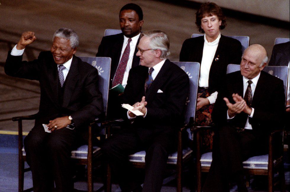 5 Nelson Mandela (izquierda) levante el brazo después de la actuación de la banda sudafricana Ladysmith Black Mombasa, durante la ceremonia de entrega del Premio Nobel de la Paz en Oslo, en 1993. REUTERS