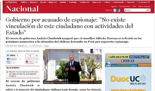 El gobierno chileno negó que esté cometiendo actos de espionaje en Perú, luego de que un connacional fuera detenido en ese país con fotos y croquis de una base militar.