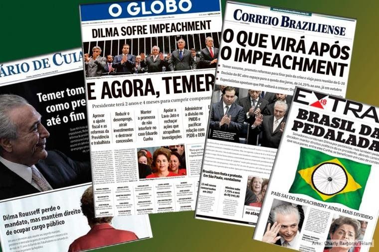 “Dilma sufre el impeachment, y ahora ¿Temer?”, con este título el O Globo, medio opositor a Rousseff, reflejó en su tapa la destitución votada el miércoles por el Senado por presuntas irregularidades fiscales, calificado por la propia ex mandataria como un "golpe de Estado" en Brasil.