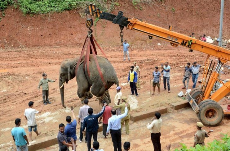 El elefante salvaje fue adormecido con tranquilizantes y levantado con una grúa para serr transportado al Santuario de Vida Silvestre de Amchang después de que se adentró en una zona residencial de Sonapur en las afueras de Guwahati, en el distrito de Kamrup, en el estado de Assam, en el noreste de India, el 1 de mayo.