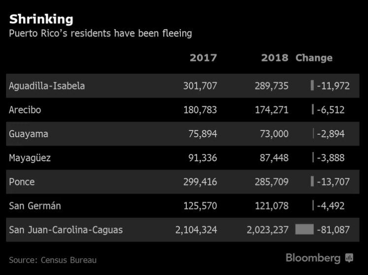 Menos de 25.000 bebés nacieron en Puerto Rico y alrededor de 31.000 personas murieron. Además, 123.400 personas simplemente abandonaron la isla. Desde el 1 de abril de 2010, la población ha disminuido en más de 531.000 habitantes, llegando a una población de 3,2 millones. La gran mayoría de las personas que viven en Puerto Rico viven en San Juan, donde la población se redujo en 3,8 por ciento, a poco menos de 2,3 millones el año pasado.