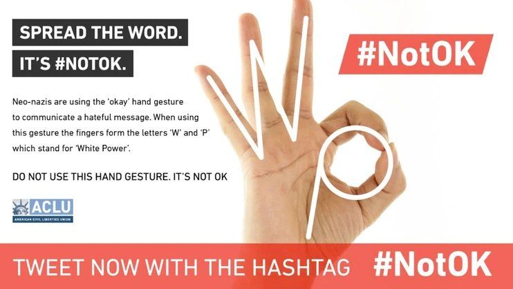“Los neo-nazis están usando el gesto de la mano “ok” para comunicar un mensaje de odio. Al hacer este gesto, los dedos forman la letra W y P que significa White Power (Supremacía Blanca). No uses este gesto con la mano, no está bien”. (Campaña de la organización American Civil Liberties Union, ACLU)