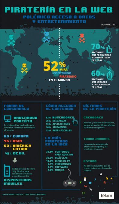 Según datos recabados por Irdeto, la Unesco y la Coalición de Creadores el 52 por ciento mira contenido pirateado en el mundo. El 70 reconoce que producirlo y compartirlo es ilegal y el 60 asume la ilegalidad de mirarlo y descargarlo.