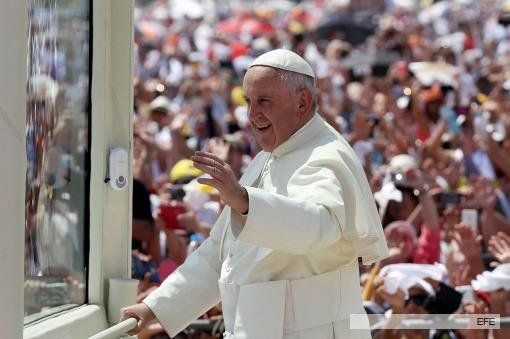 papamóvil para ser saludado por los fieles, algunos con banderas de