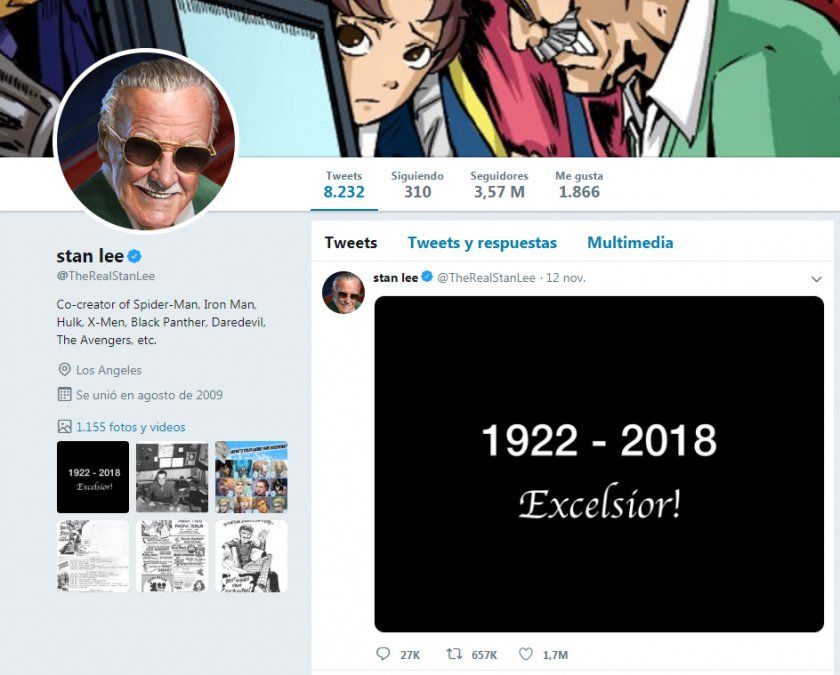 En la cuenta @TheRealStanLee, la despedida quedó reflejada en una sola palabra: ¡Excelsior! junto a los años de nacimiento y muerte del fundador de Marvel Comics.