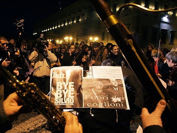 En un clima de alegría, los músicos conmemoraban la salida de Berlusconi, mientras otros silbaban y abucheaban al ritmo de "¡Ciao, ciao!".Cientos de estudiantes universitarios, que crecieron bajo el "berlusconismo", se agruparon ante el Quirinale, con la esperanza de brindar por el final del gobierno de derecha.