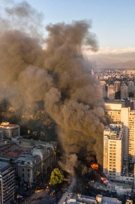 En el centro de Santiago un edificio se incendió tras los violentos enfrentamientos. Luego de un par de horas, los bomberos contuvieron las llamas, que afectaron a tiendas comerciales en la esquina de las calles Santa Rosa y la Alameda.