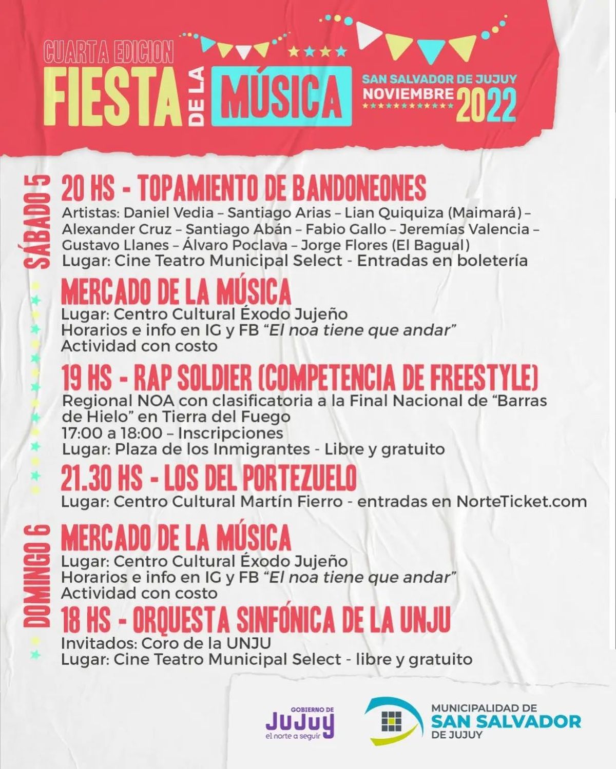 Finalmente el domingo 6 en el Cine Teatro Municipal Select a partir de las 18 hs. se presenta la Orquesta Sinfónica de la UNJU y el coro con entrada libre y gratuita, también a las 18 hs. en el Centro Cultural Éxodo Jujeño tendrá lugar el “Mercado de la Música” (actividad con costo).