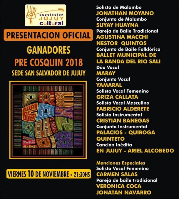 La Asociación Civil Jujuy Cultural invitó a la comunidad a participar de la presentación oficial de los ganadores del PRE COSQUIN 2018, sede San Salvador de Jujuy. El evento se realizará este viernes 10 de noviembre desde las 21.30 en el Centro Cultural Éxodo Jujeño, ubicado en la avenida Presidente Perón esquina Bahía Blanca.
