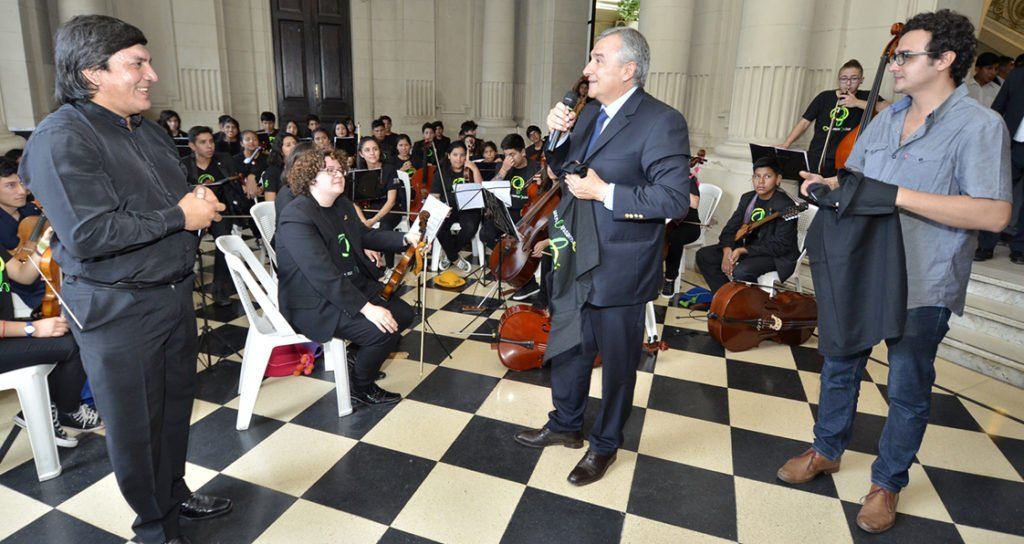 Los pequeños y grandes músicos del Sistema de Orquestas de Jujuy, a cargo del profesor Sergio Jurado, se presentaron este miércoles en el hall de Casa de Gobierno donde brindaron un repertorio variado ante el gobernador y todos los presentes.